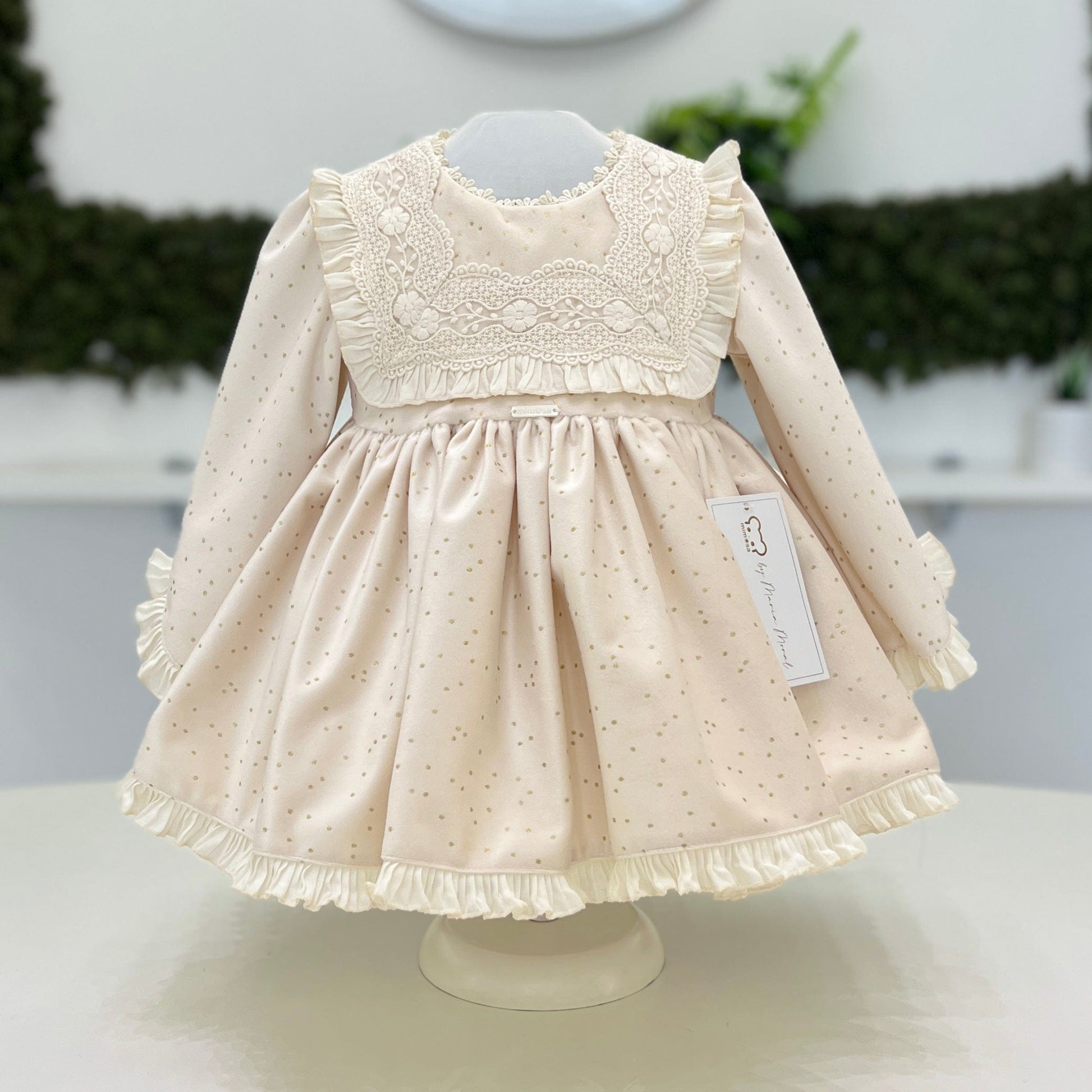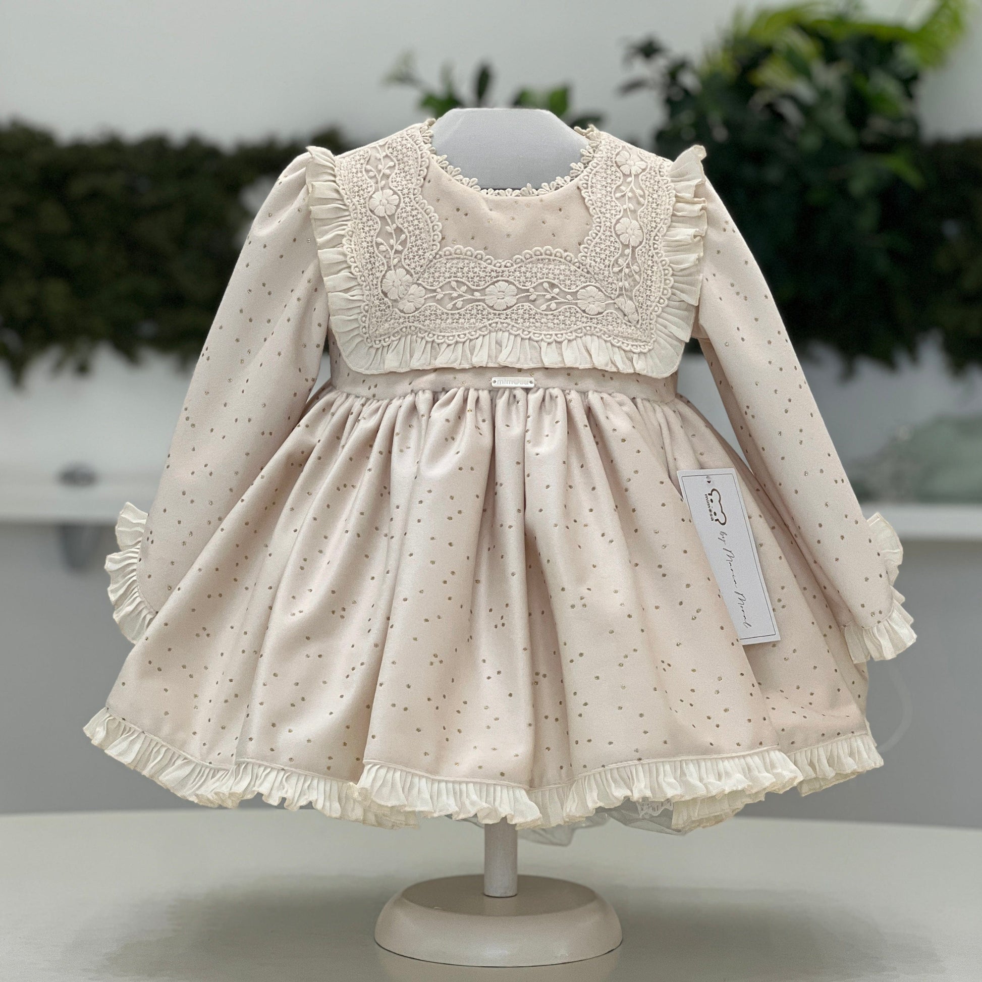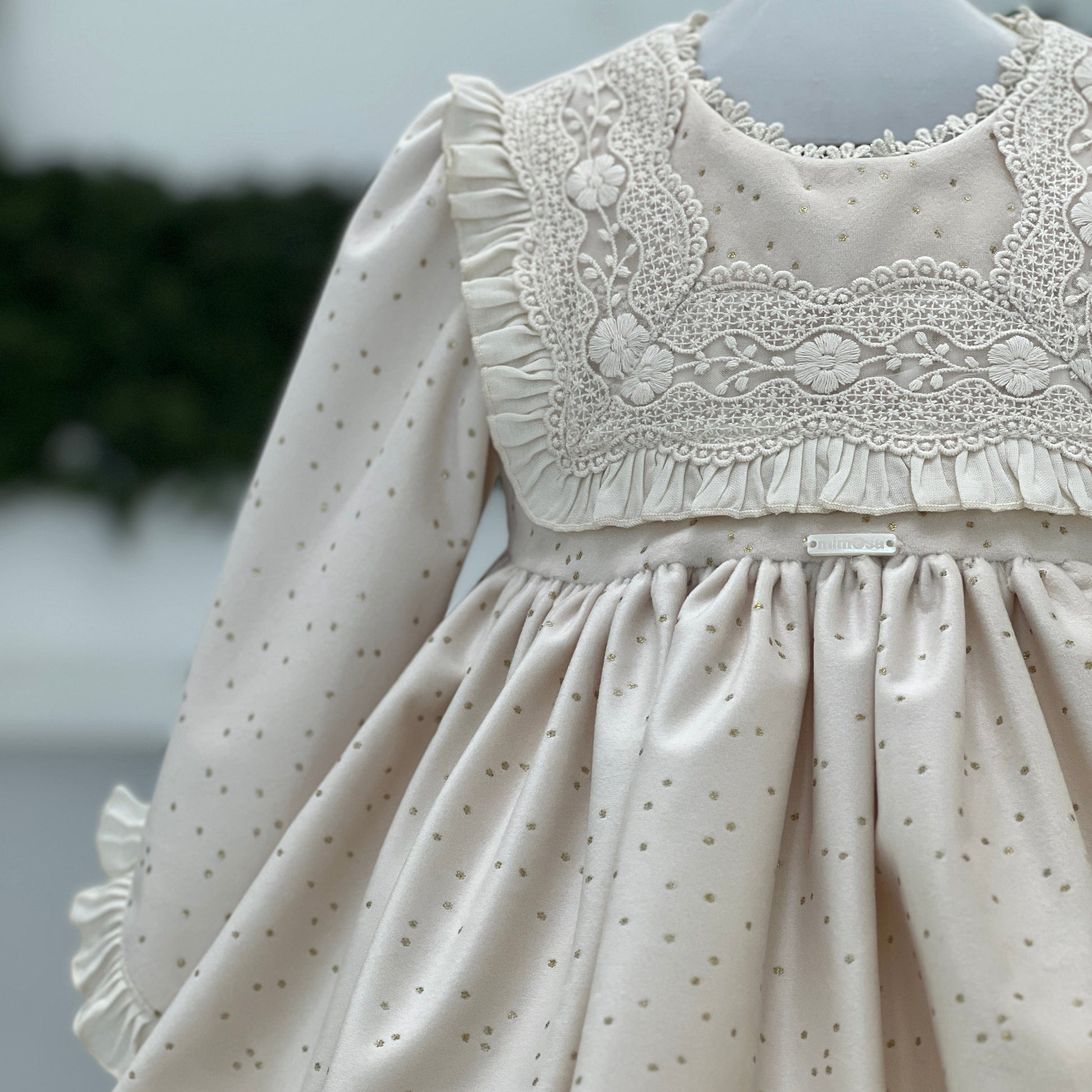 Eleganza senza tempo in versione baby. Realizzato in morbido velluto color avorio con delicati pois dorati, presenta un corpetto impreziosito da ricami e ruches che incorniciano la silhouette con raffinatezza. La linea svasata e i dettagli plissettati donano movimento e un’allure preziosa, perfetta per le occasioni speciali.