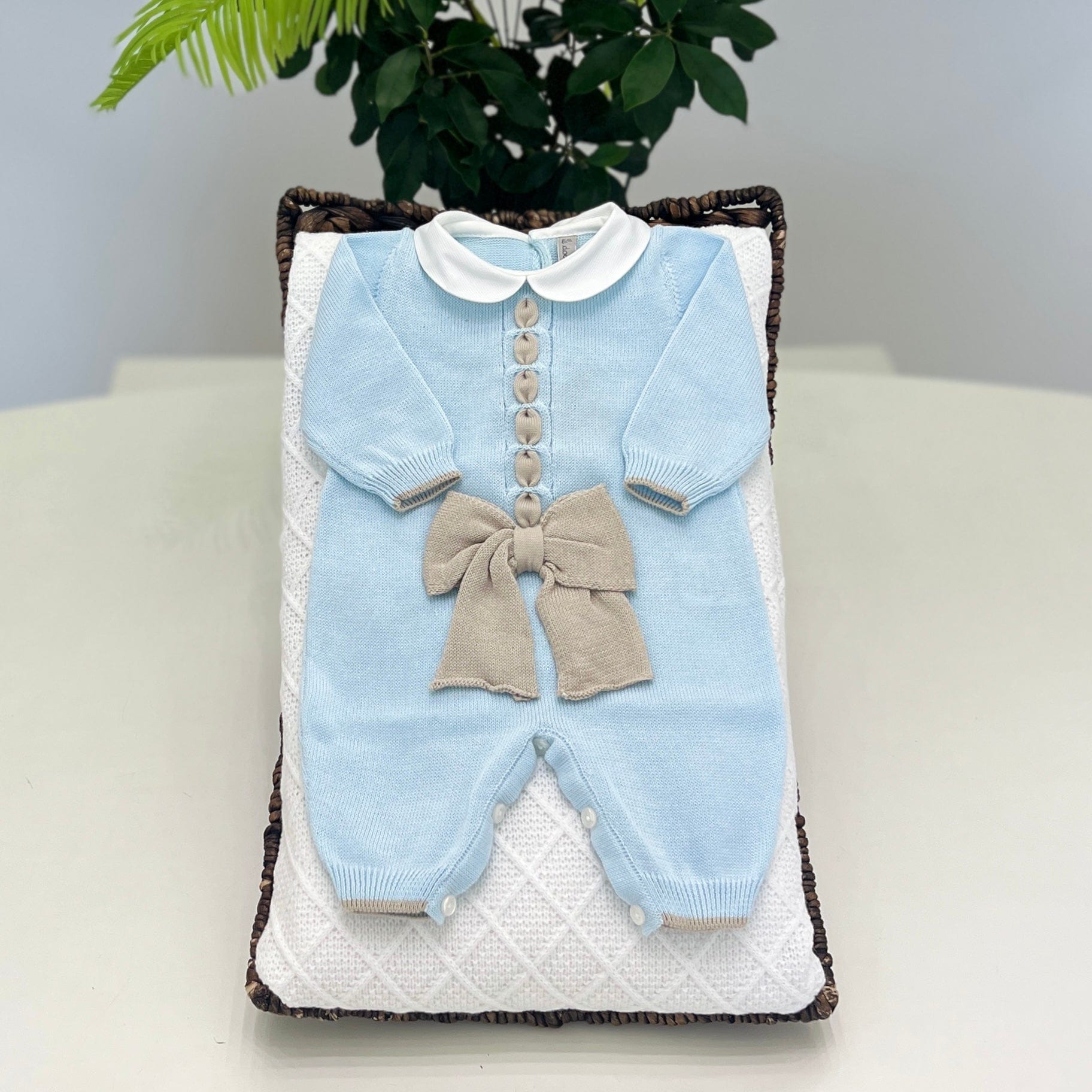Elegante e confortevole, questa tutina intera in filo di cotone celeste è arricchita da un colletto in piqué bianco, che aggiunge un tocco di freschezza e raffinatezza. Il passanastro con fiocco in filo beige dona un dettaglio delicato e sofisticato, mentre la morbidezza del tessuto garantisce comfort e traspirabilità per il neonato. Perfetta per ogni occasione speciale nei primi giorni.
