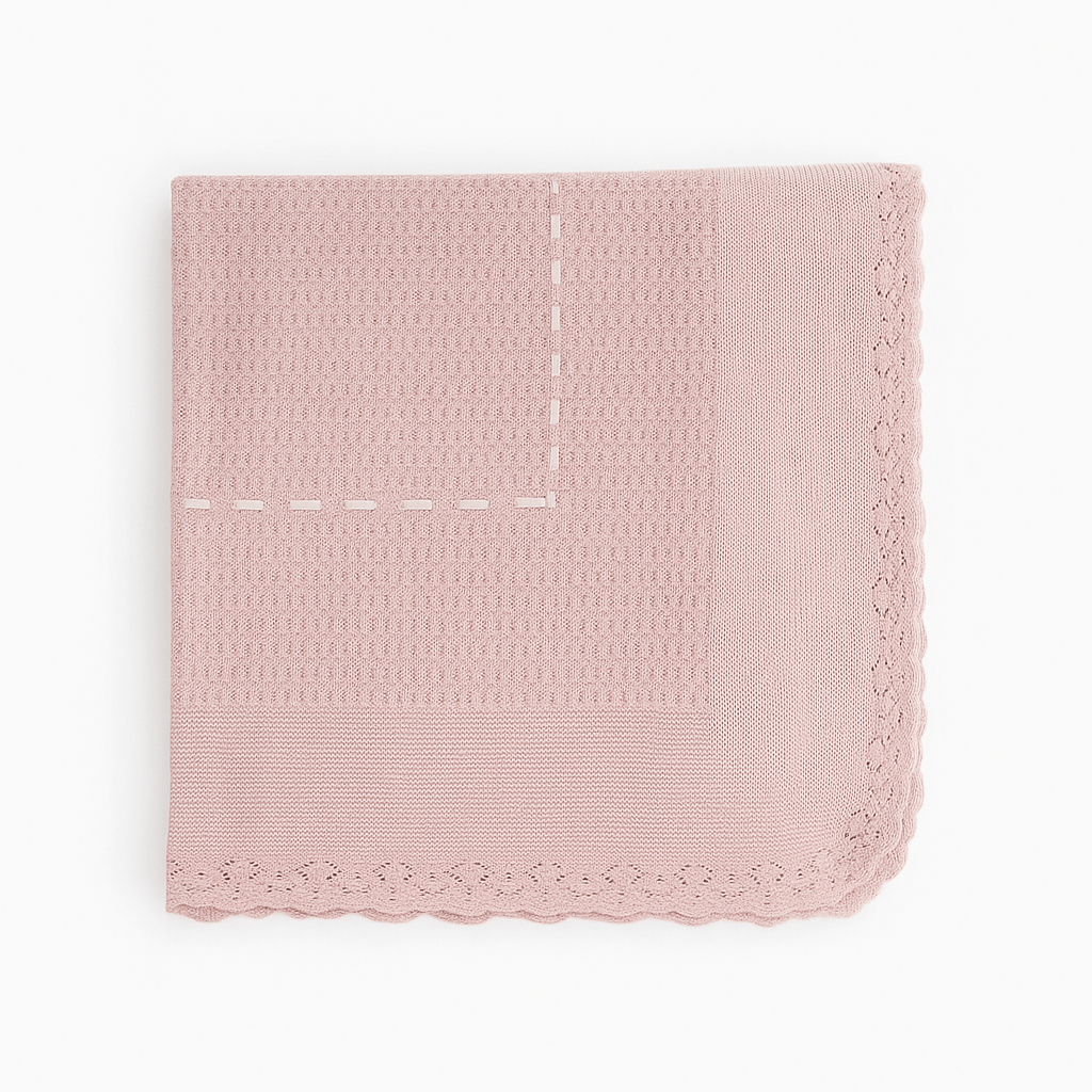 Coperta neonata in misto lana rosa con lavorazione a maglia, rifinita con smerlo e fiocco bianco applicato.