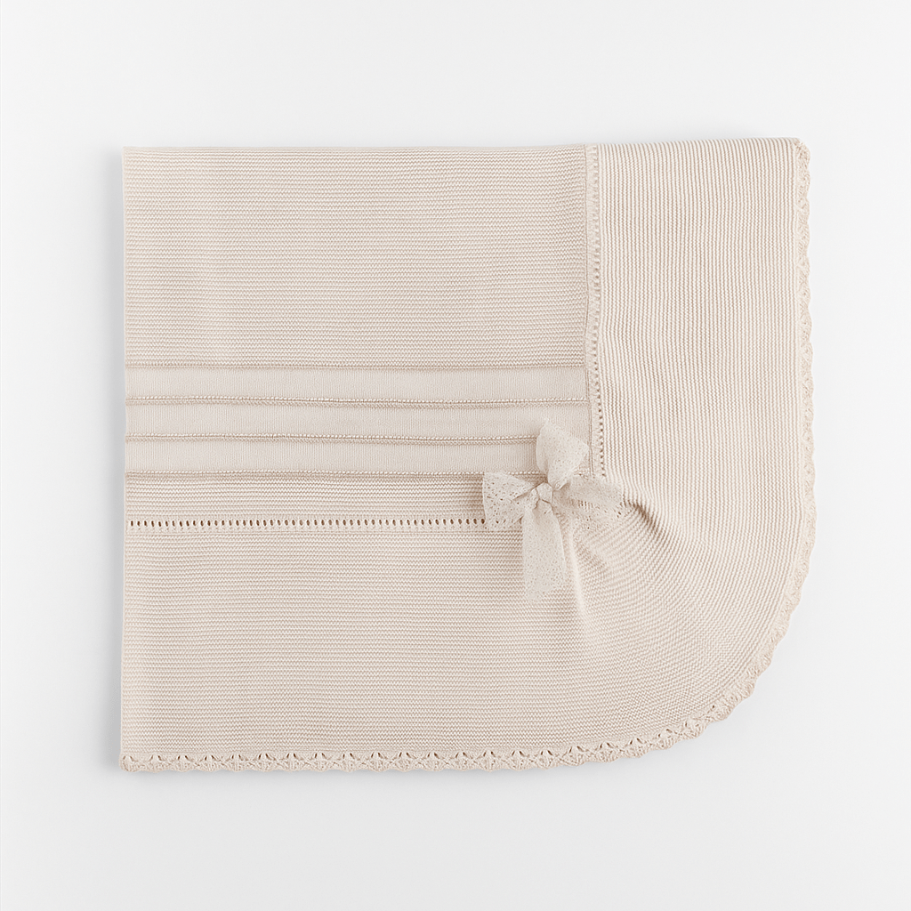 Coperta in misto lana con bordo smerlato rifinito da filo lurex. Al centro presenta inserti effetto peluche con delicati trafori, impreziosita da un fiocco in tulle glitterato oro in armonia con il bordo.