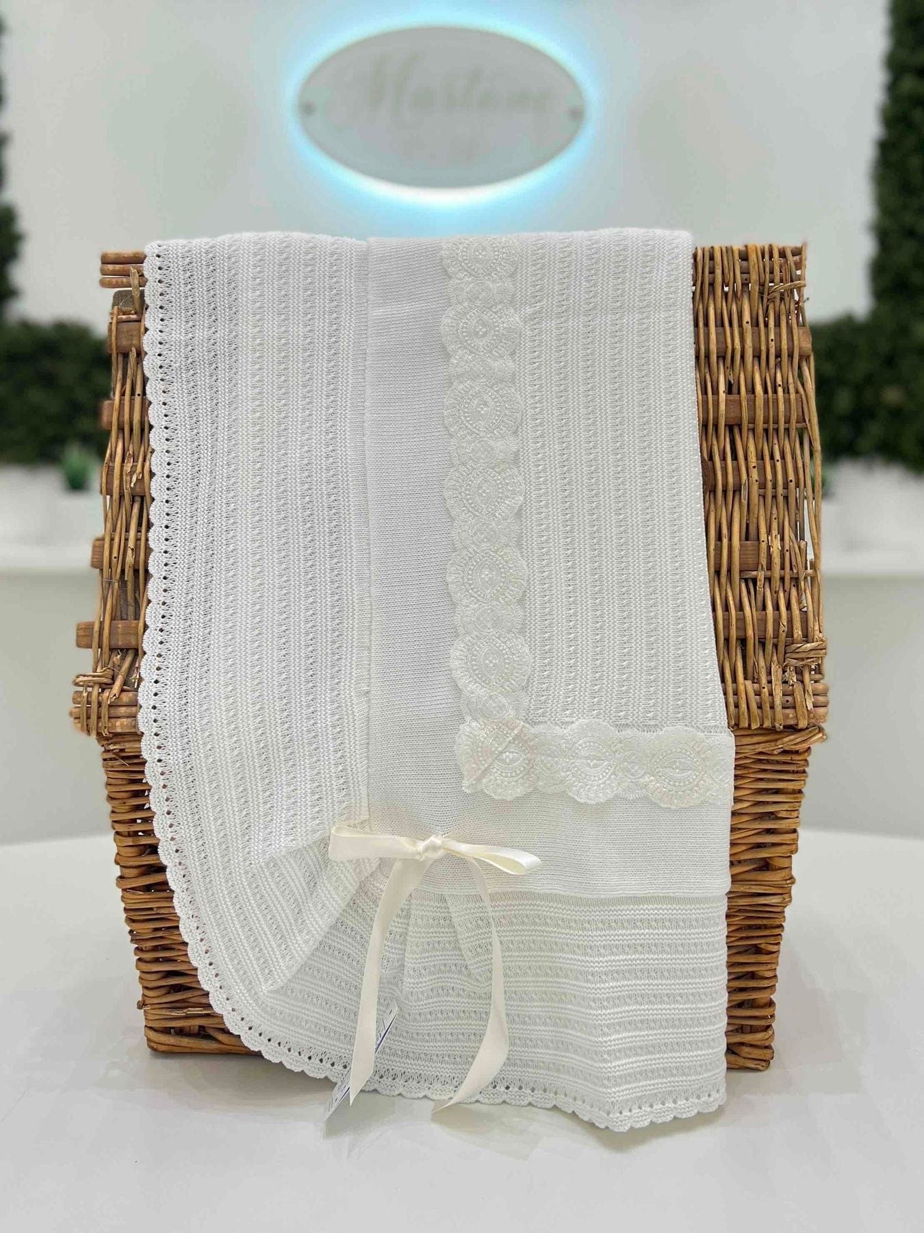 Coperta neonata in filo di cotone con bordo a smerlo, applicazioni in pizzo e trama traforata.