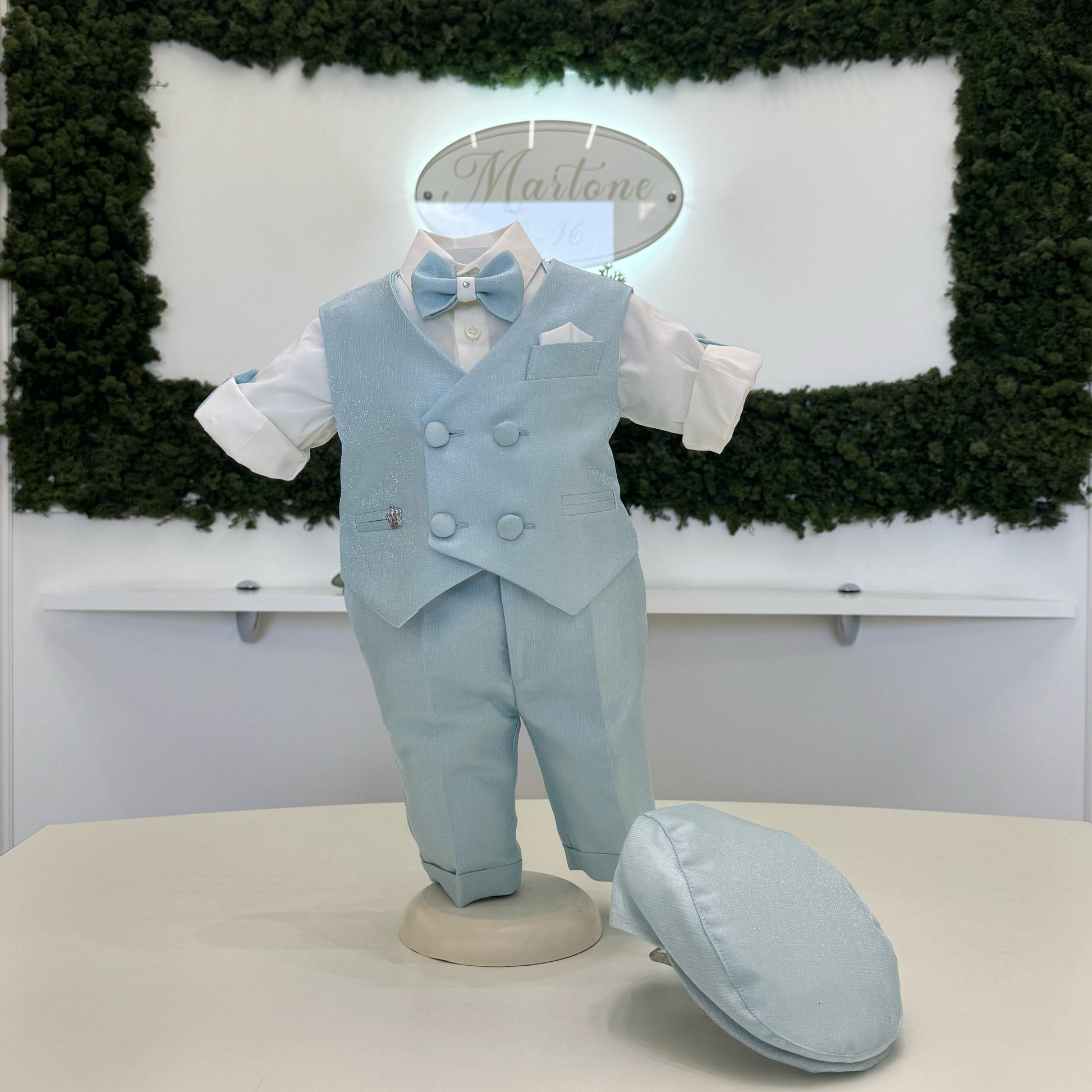 Un abito battesimale dallo stile sofisticato e luminoso, interamente realizzato in un tessuto celeste con microglitter, che dona un’eleganza delicatamente brillante. Il gilet doppiopetto, abbinato al pantalone coordinato, esalta il carattere esclusivo dell’insieme, creando un look armonioso e ricercato. La camicia in cotone bianco con risvolti aggiunge un dettaglio raffinato, mentre il papillon nello stesso tessuto, arricchito da un brillante, completa l’outfit con un tocco di classe e luce. Perfetto per un battesimo indimenticabile.