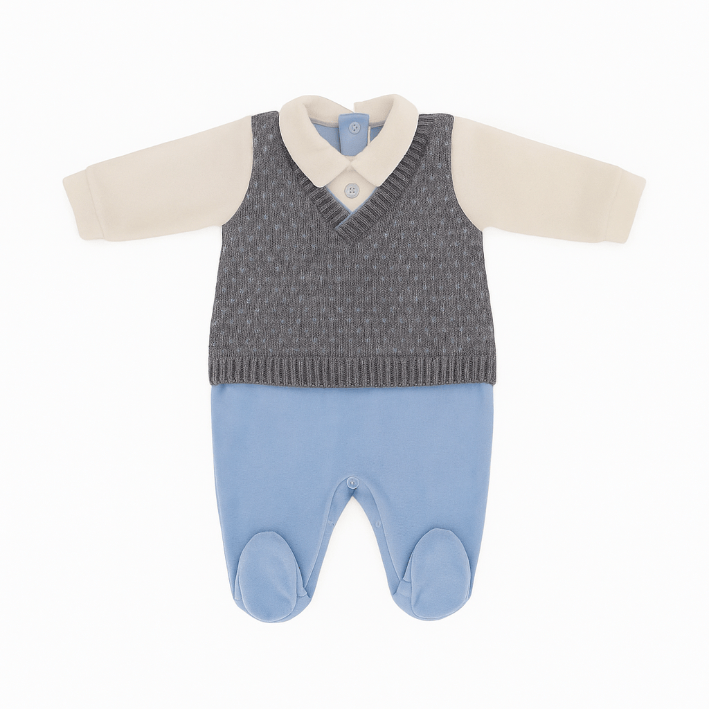 Tutina in ciniglia con parte superiore effetto camicina color avorio, gilet lavorato grigio integrato con scollo a V e bottoncino decorativo. Parte inferiore in ciniglia azzurra con piedini e apertura al cavallo con bottoni a pressione.