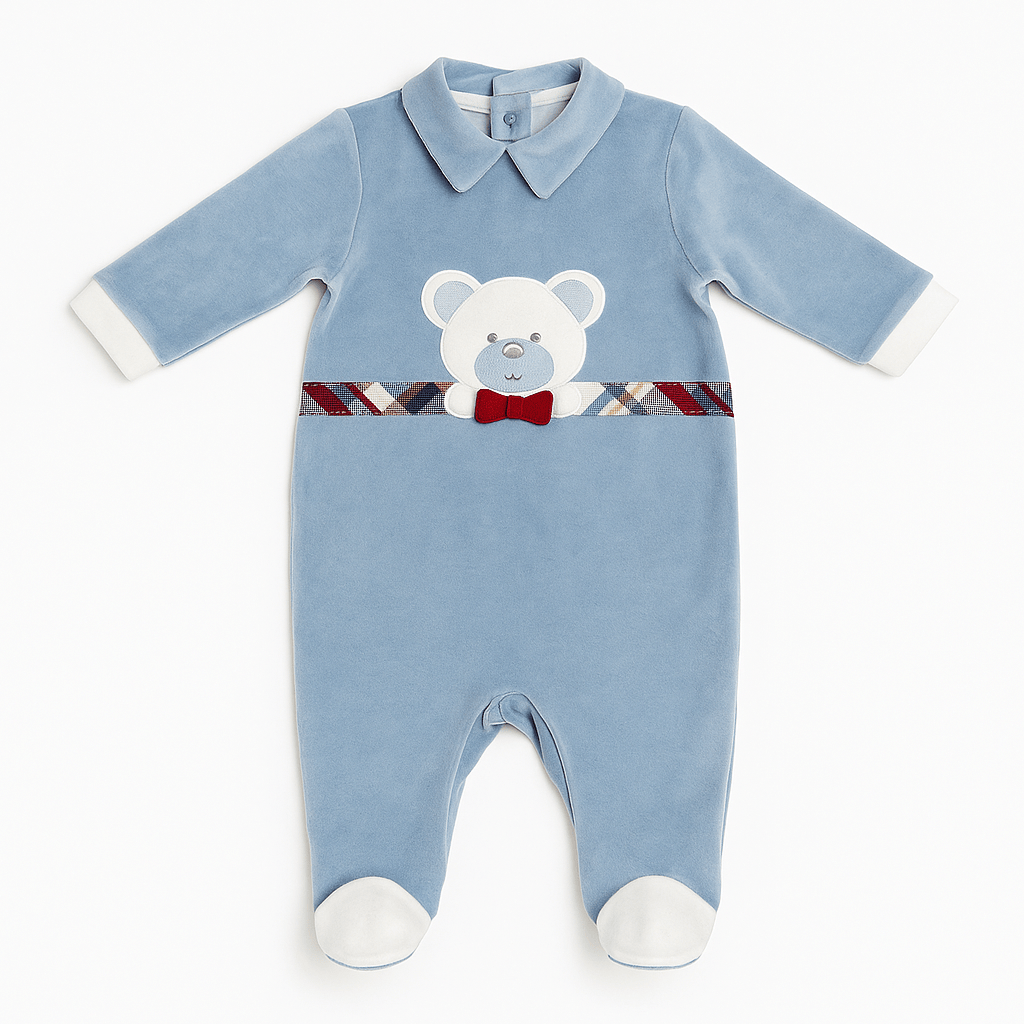 Tutina in ciniglia azzurra con colletto, applicazione orsetto frontale e fascia decorativa scozzese in vita, maniche lunghe e piedini bianchi. Chiusura posteriore e al cavallo con bottoni a pressione.