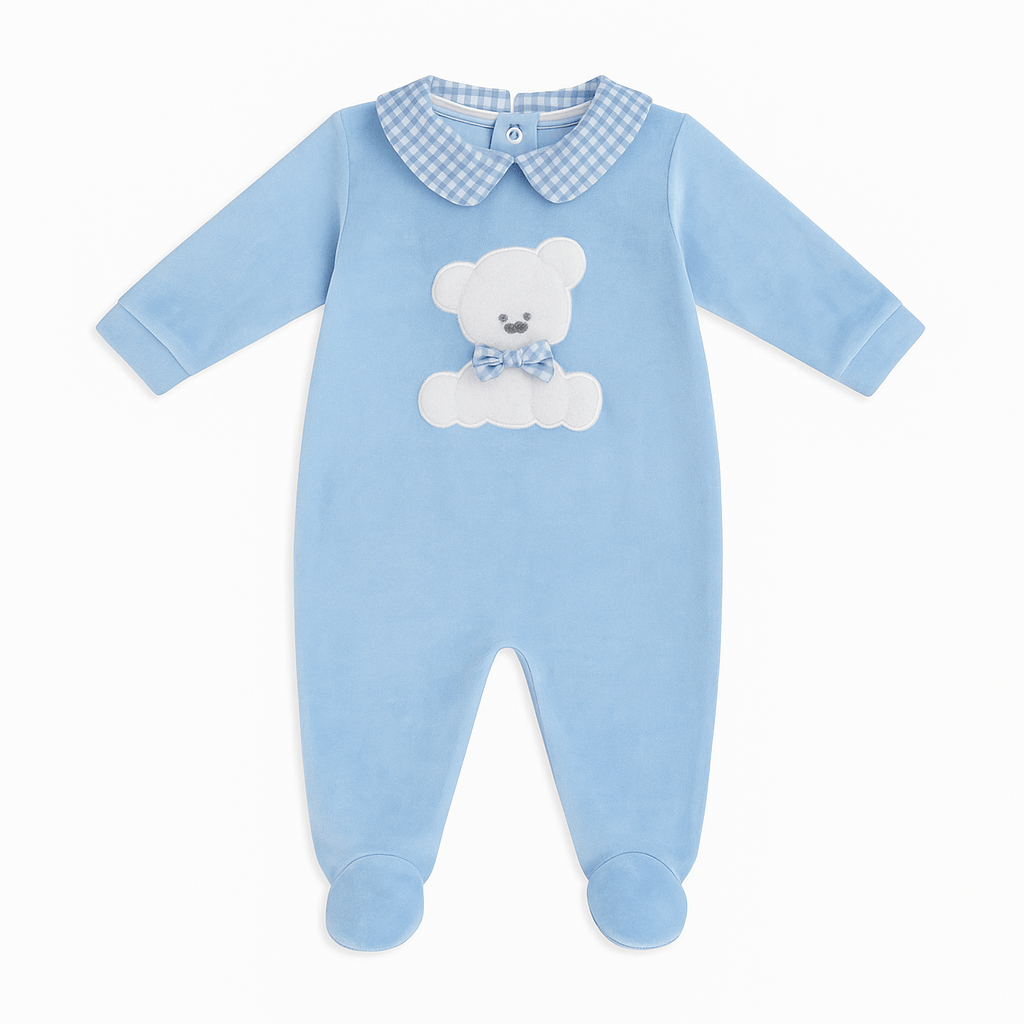 Tutina in ciniglia azzurra con colletto vichy, applicazione orsetto con fiocchetto, maniche lunghe e piedini integrati. Apertura posteriore e al cavallo con bottoni a pressione.