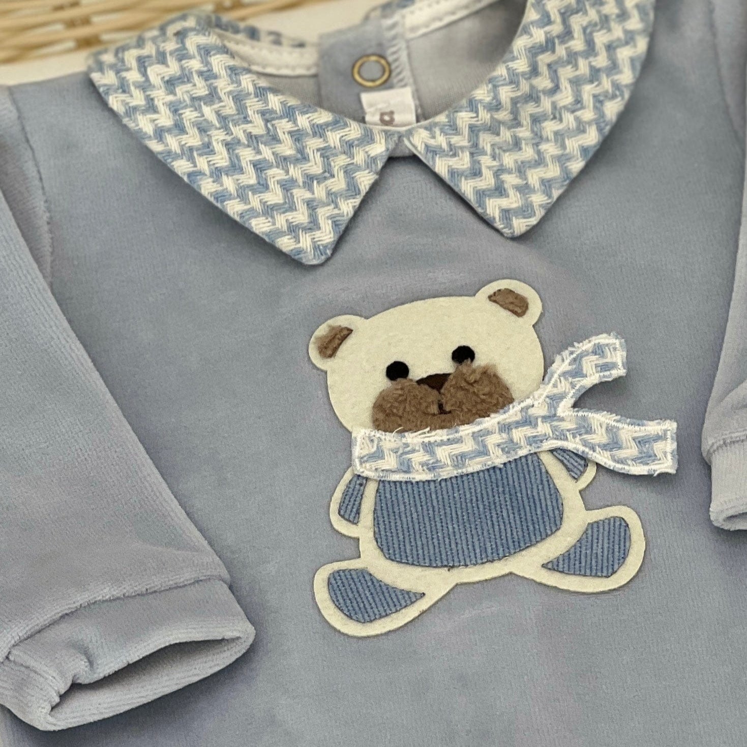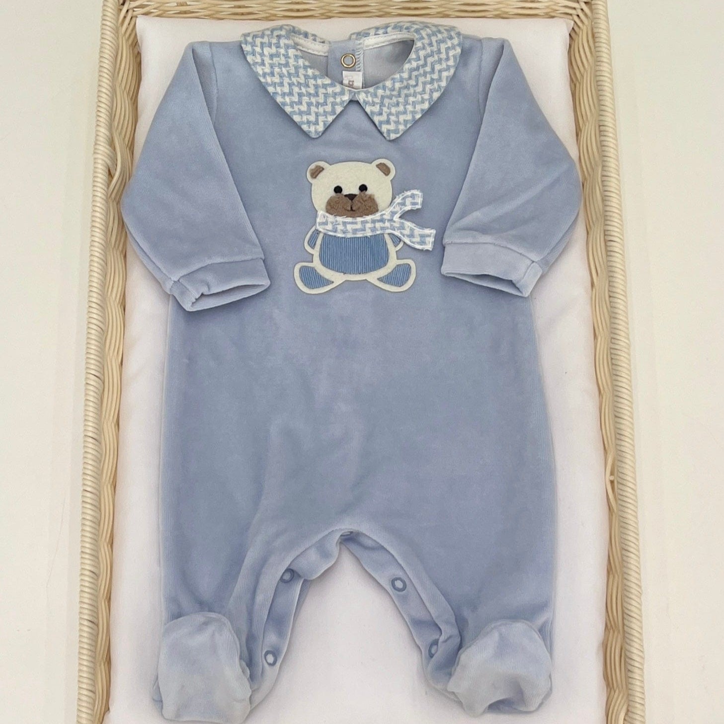 Tutina intera in ciniglia per neonato, soffice e delicata, di un dolce color celeste. Sul petto è ricamato un tenero orsetto, che aggiunge un tocco adorabile al design. Ideale per avvolgere il bebè in morbidezza e comfort.