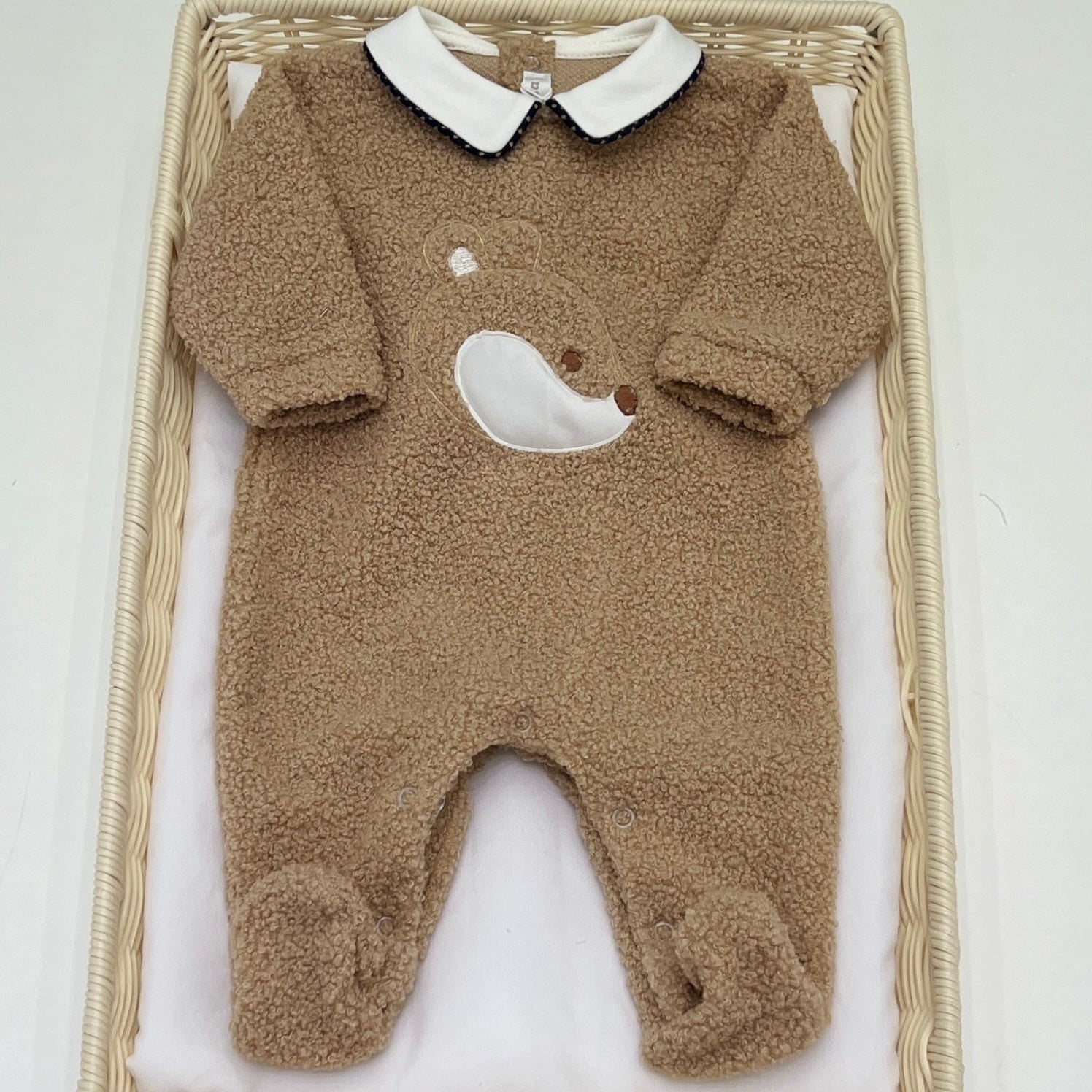 Una tutina per neonato in morbido bouclè marrone, che avvolge il piccolo in un abbraccio caldo e coccoloso. Il tessuto bouclè offre una texture leggermente ondulata e ricca, ideale per mantenere il comfort e il calore. Il design semplice e elegante rende la tutina perfetta per le giornate fresche, combinando praticità e stile.
