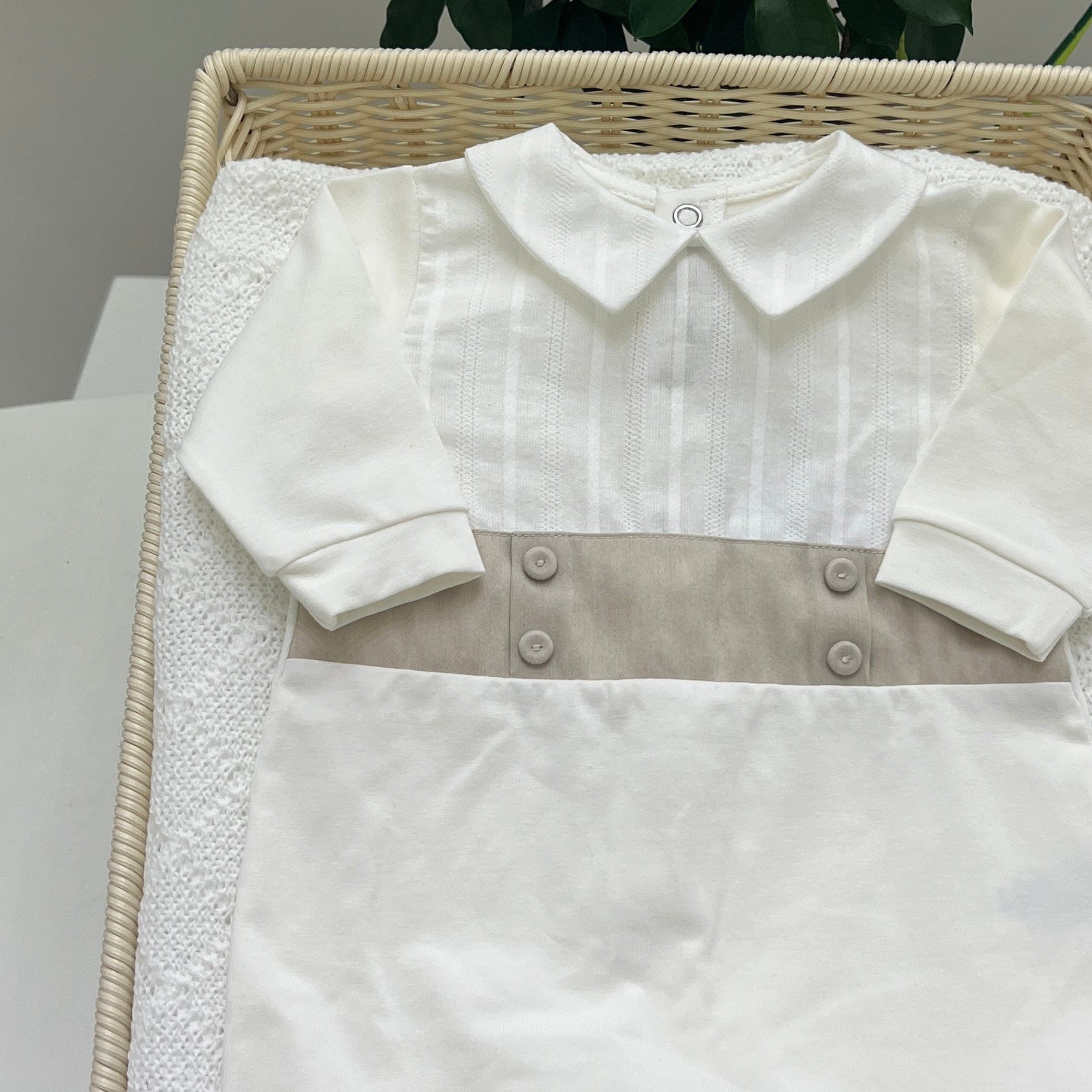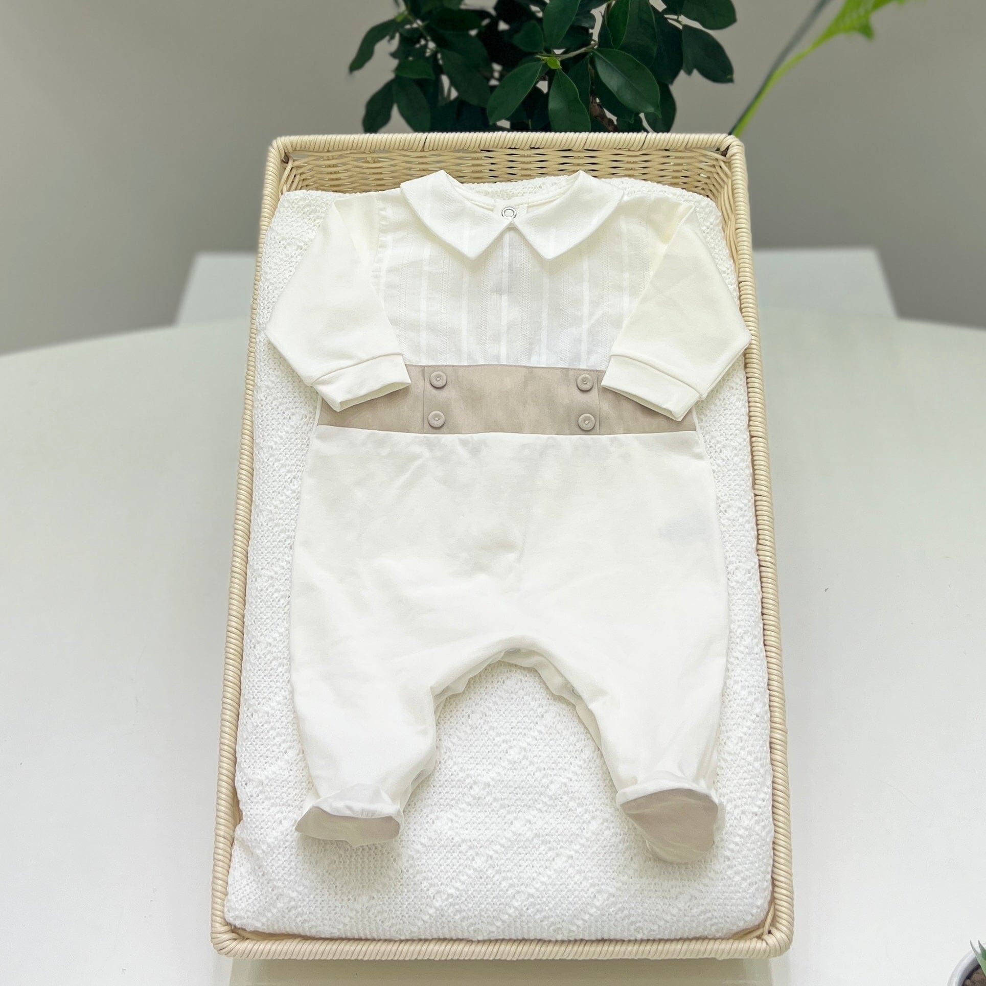 Una tutina intera per neonato in morbido cotone, arricchita da un raffinato dettaglio sulla maglia in lino e cotone operato. Un capo dal design elegante e curato, perfetto per avvolgere il tuo piccolo in comfort e stile in ogni occasione speciale.