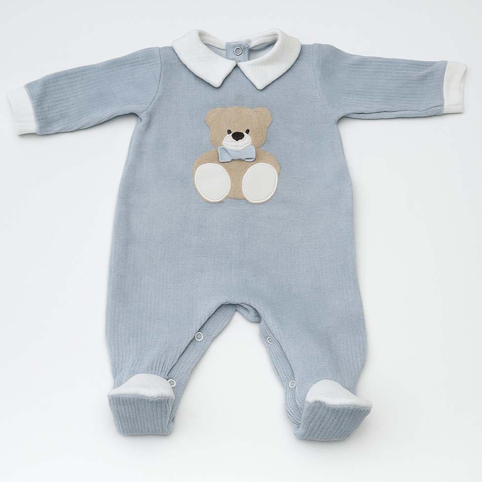 Tutina intera in ciniglia con trama a rilievo a quadretti e tenero orsetto ricamato sul davanti.