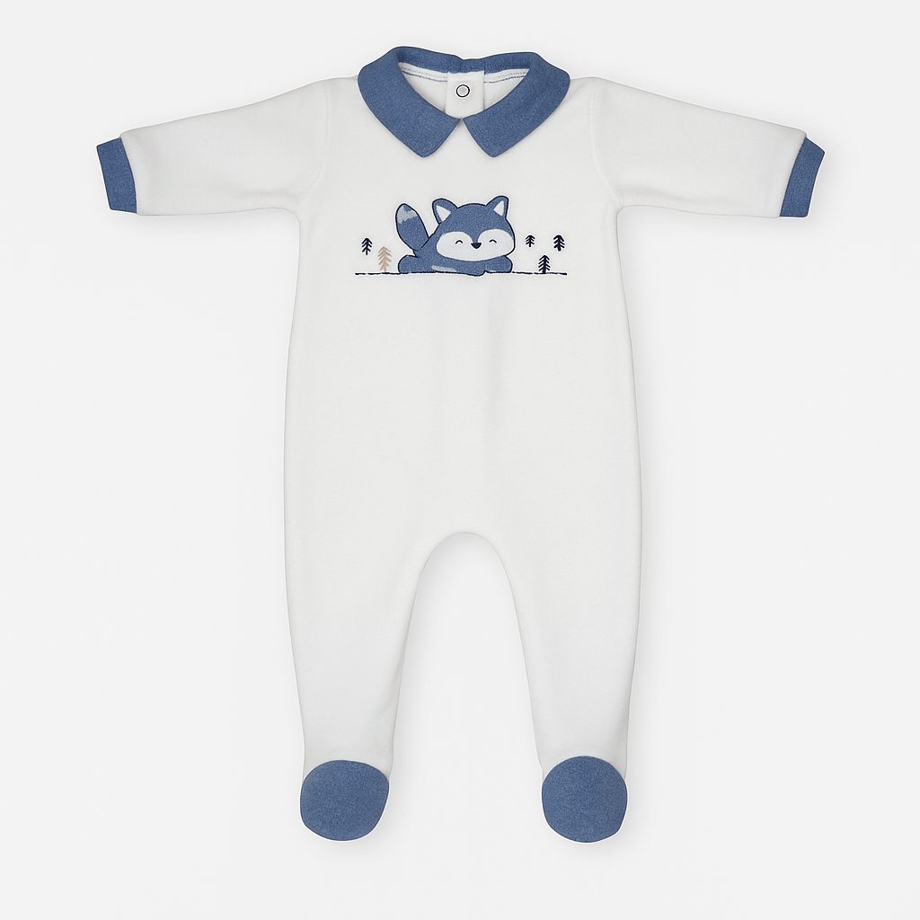 Tutina intera in ciniglia, soffice e confortevole, con dolce volpino ricamato sul davanti.