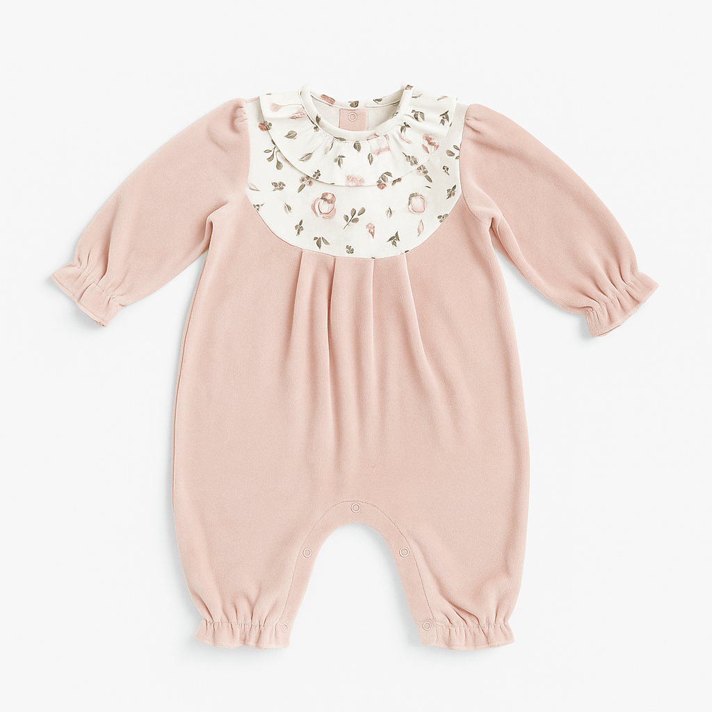 Tutina in ciniglia rosa con inserto frontale a motivo floreale e maniche arricciate. Apertura con bottoncini a pressione sul retro e sul cavallo.