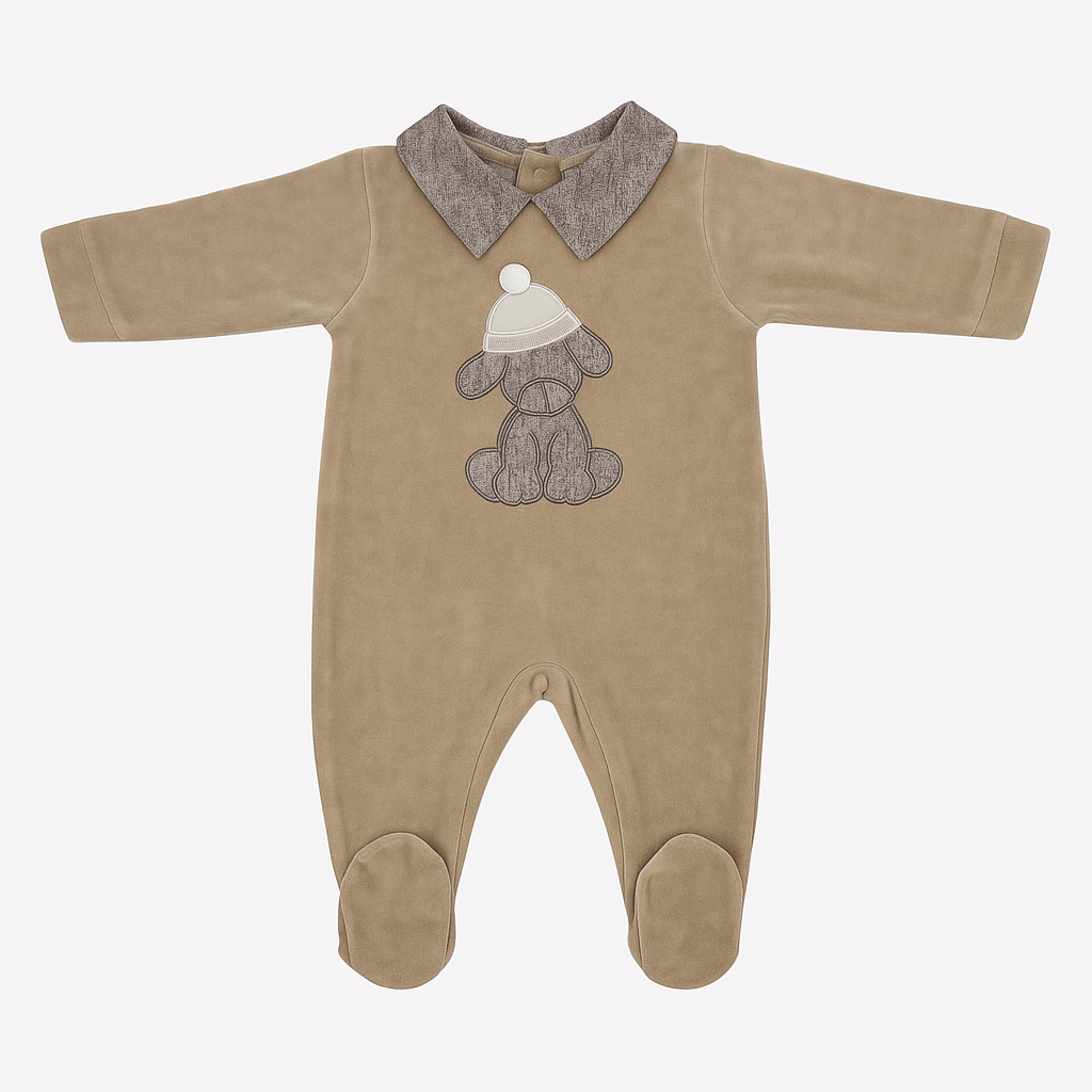 Tutina in ciniglia color cammello con colletto in tessuto melange, applicazione cagnolino sul davanti, maniche lunghe e piedini integrati. Apertura posteriore e al cavallo con bottoni a pressione.