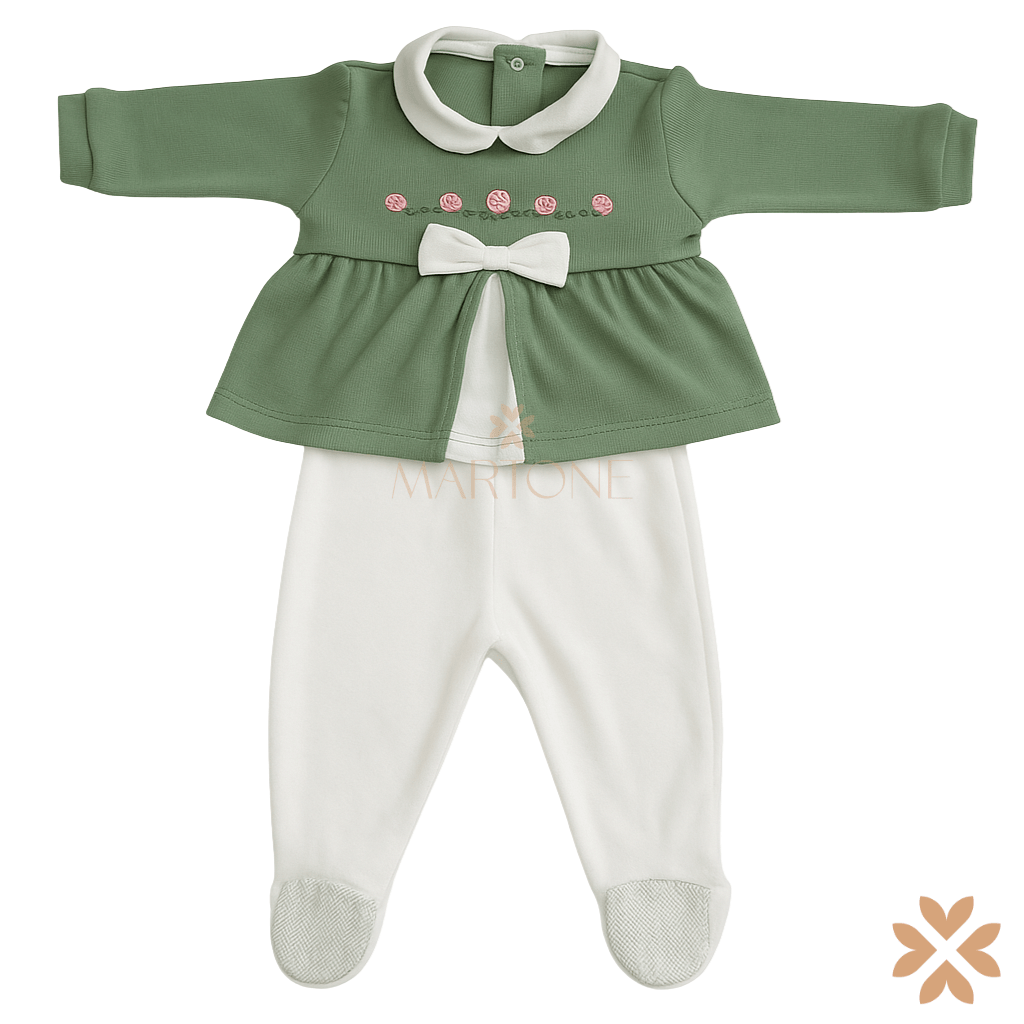 Tutina due pezzi effetto completo, con parte superiore verde salvia e colletto in contrasto panna. Impreziosita da un ricamo floreale e fiocco centrale, presenta una linea svasata che si apre su un morbido piedino in tinta. Un capo dolce e raffinato, perfetto per le prime occasioni speciali.