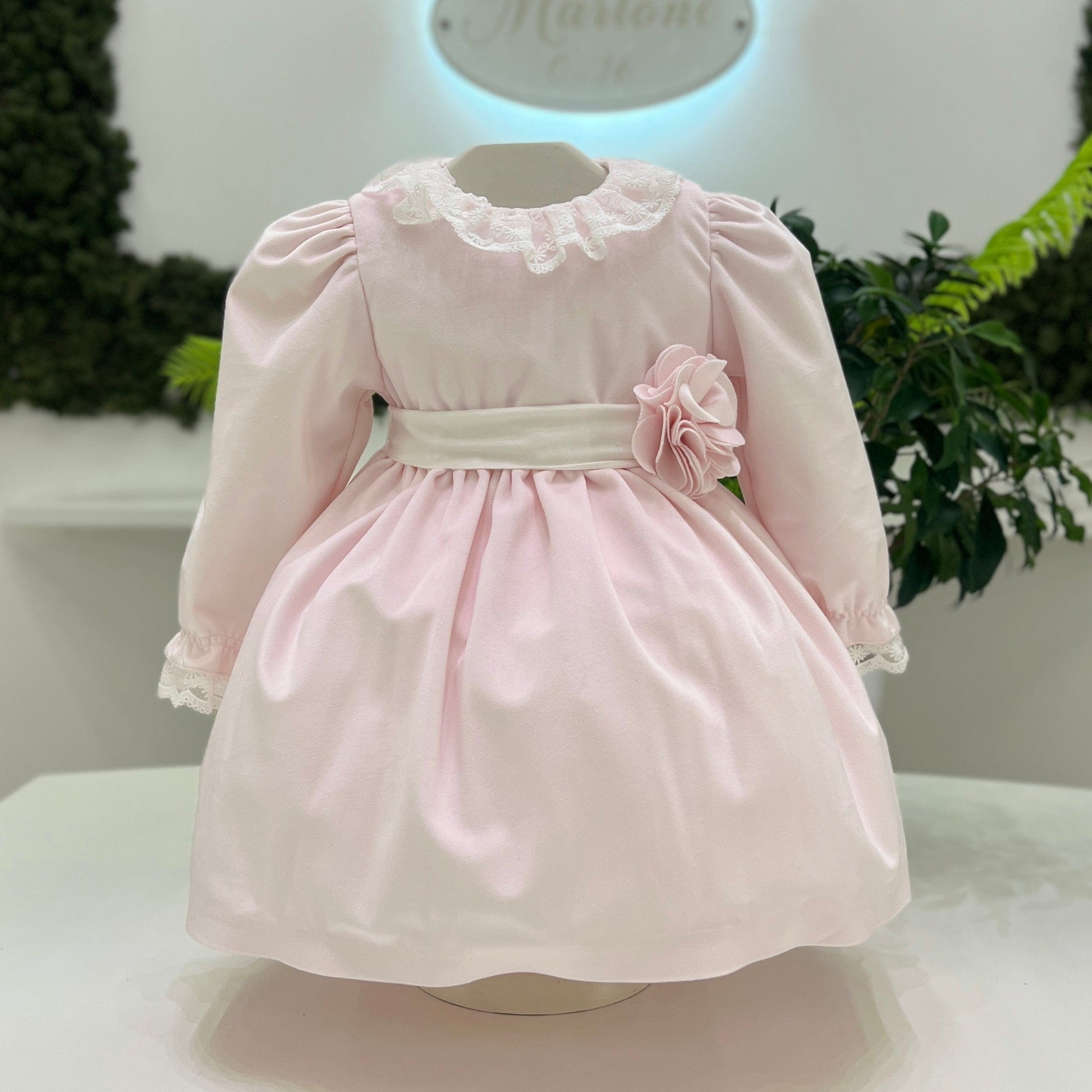 Abito in velluto manica lunga bordata in pizzo, colletto arricciato in picco e cintura con dettaglio floreale.