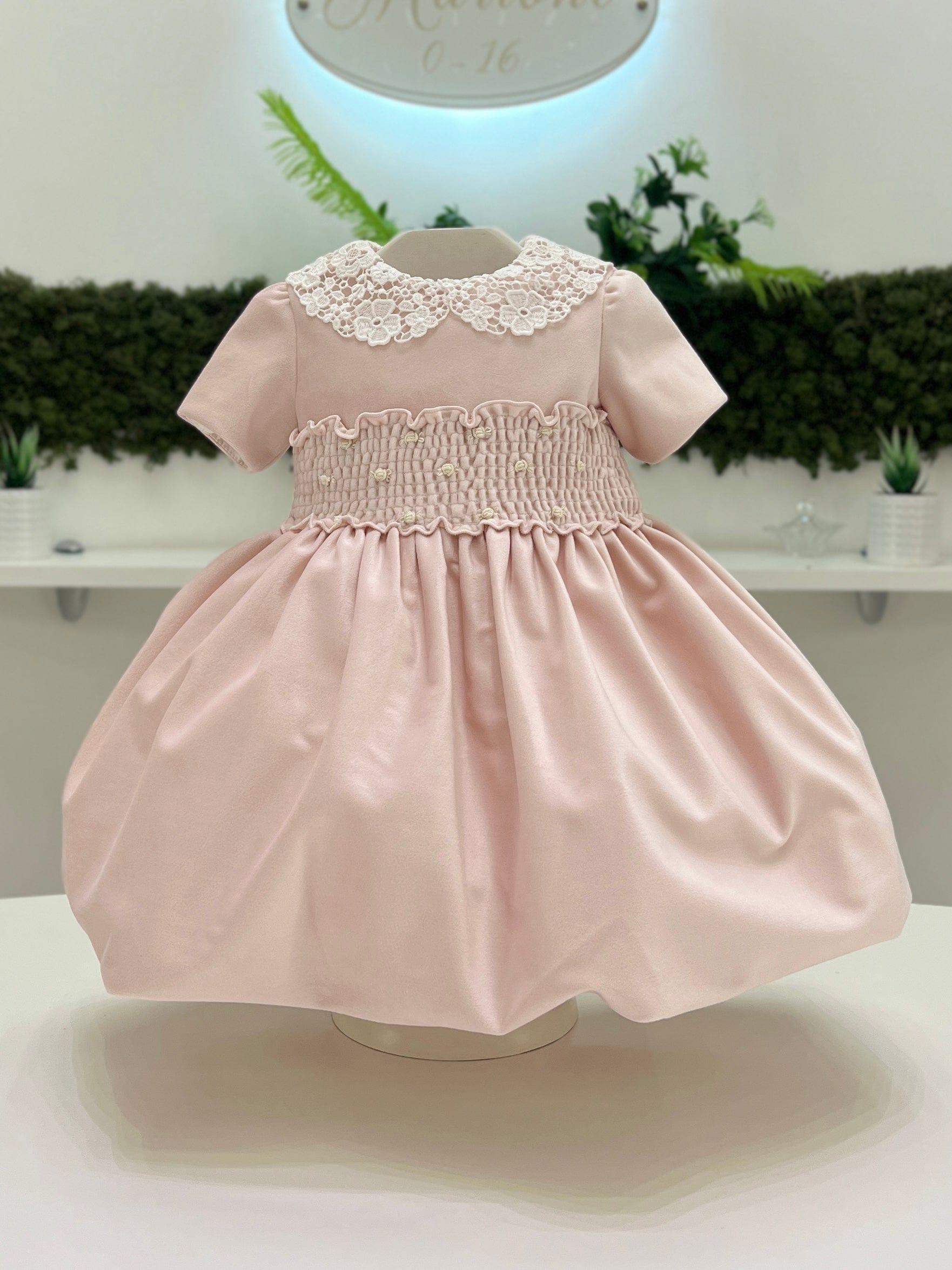 Vestina invernale rosa a palloncino per bimba, realizzata in velluto morbido e caldo. Il design a manica corta dona un tocco elegante, mentre il punto smock sul corpetto è arricchito da delicate roselline ricamate a vapore in vita. Il colletto in macramè ed il fiocco sul retro aggiungono un raffinato dettaglio, perfetto per le occasioni speciali.