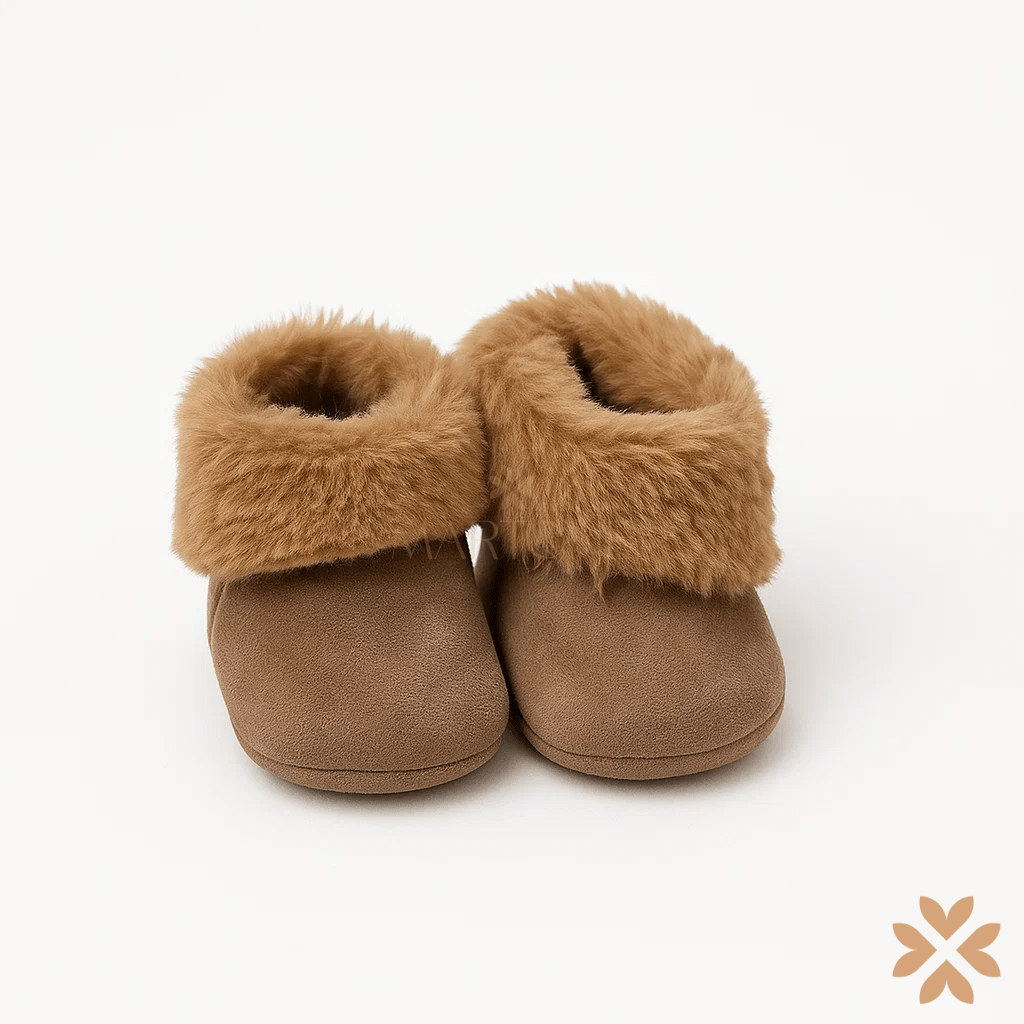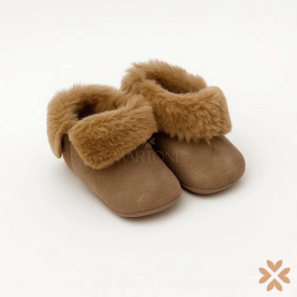 Scarpina da culla in tessuto scamosciato beige con interno e bordo in morbida pelliccetta. Il design richiama un mini stivaletto invernale, caldo e avvolgente, ideale per coccolare i piedini della neonata con comfort e stile.